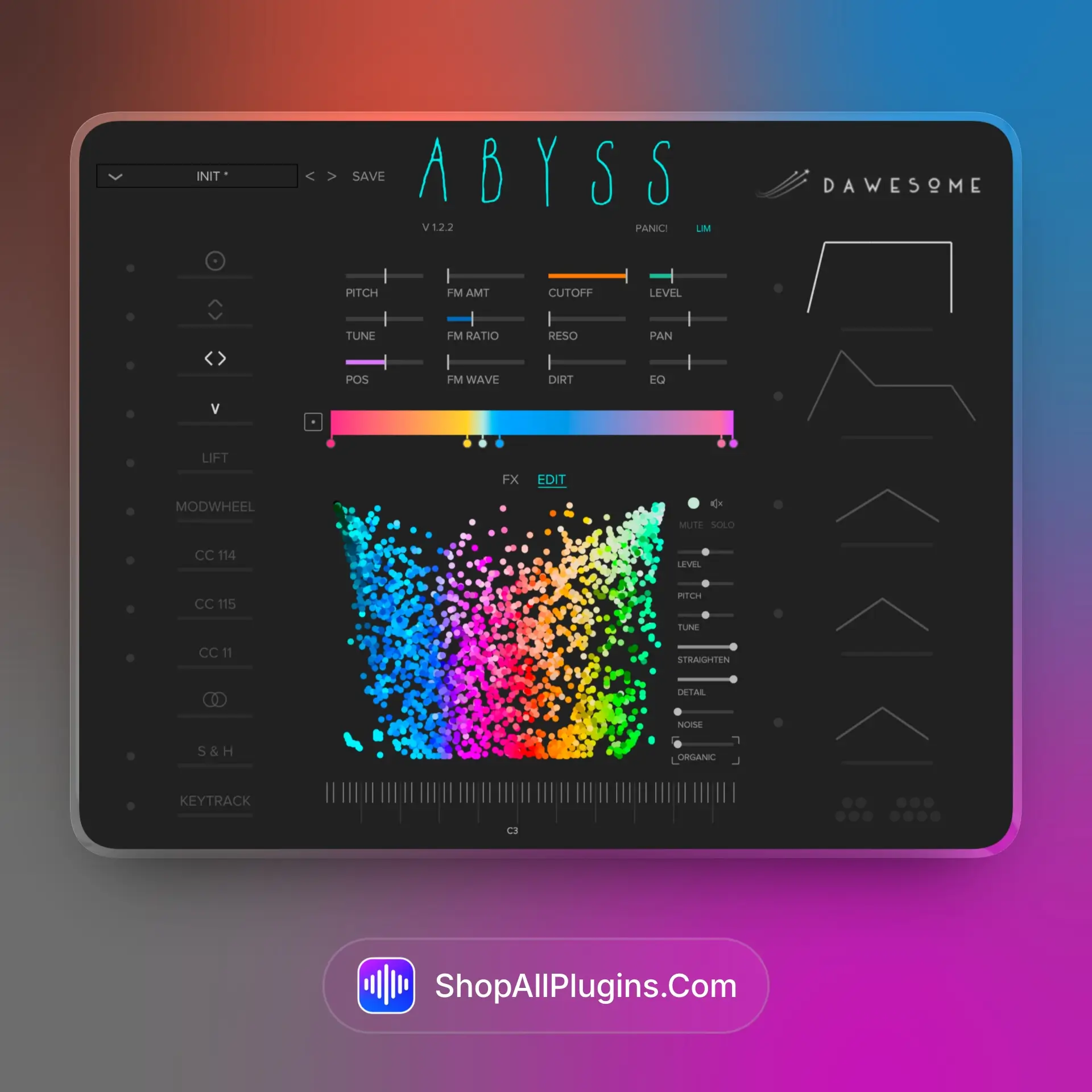Dawesome Abyss is the visual synthesizer featuring 2D grid of over 2000 harmonic combinations with color-coded timbres, sound surfing for selecting tone colors, spectral processing for modification, and 13 modulation sources with 23 destinations, designed for sound designers, electronic producers, and composers seeking dark vibrating drones, vivid cinematic pads, and rich evolving textures for ambient, cinematic, and experimental music production in 2026.