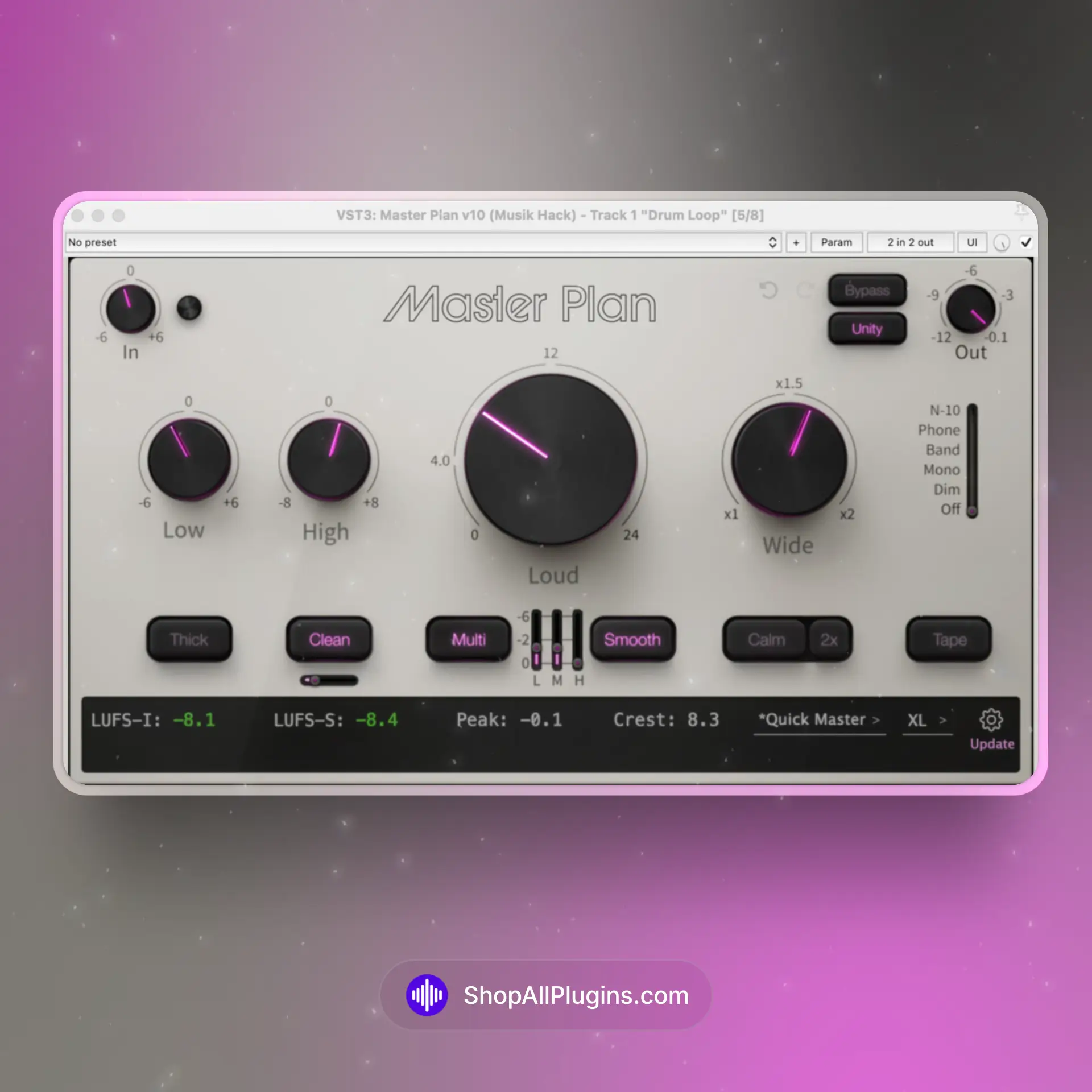 Musik Hack Master Plan is a streamlined, pro-grade mastering plugin that delivers polished, release-ready masters in minutes. With intuitive controls and a powerful internal chain, it’s perfect whether you’re wrapping up a mix, polishing stems, or dialing in your final master.