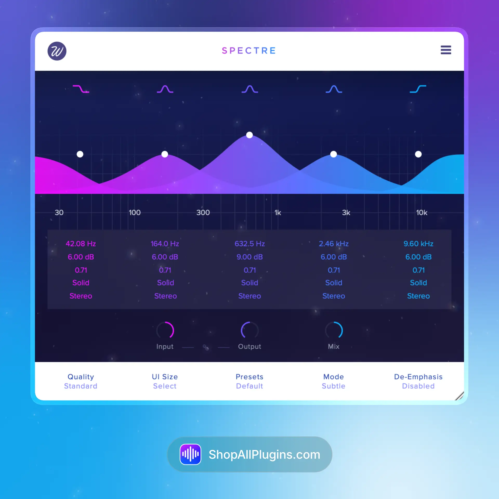 Wavesfactory Spectre is a multiband enhancer and saturation plugin that works like a graphical EQ, but instead of only boosting volume, it adds harmonic content exactly where you place the bands. It is a go-to for making dull vocals feel brighter, helping bass translate on small speakers, adding density to drums, and doing clean mastering-style enhancement without harshness.